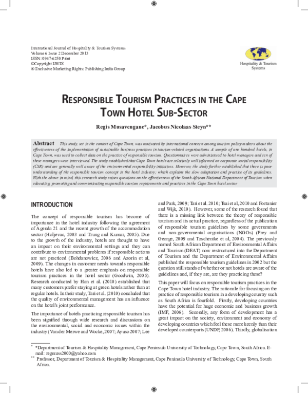 Pdf Responsible Tourism Practices In The Hotel Sub Sector Case Of Cape Town Regis Musavengane Academia Edu Tourism Malaysia In London