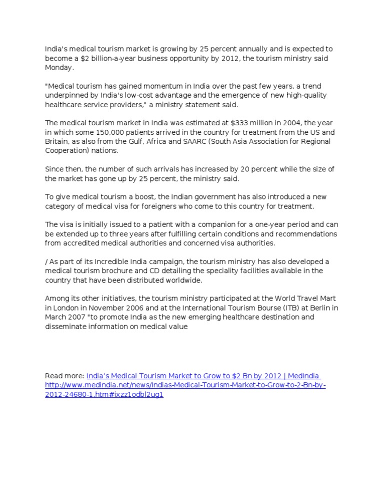 India S Medical Tourism Market To Grow To 2 Bn By 2012 Medindia 2012 24680 1 Htm Ixzz1odbl2ug1 Tourism Ministry Japan