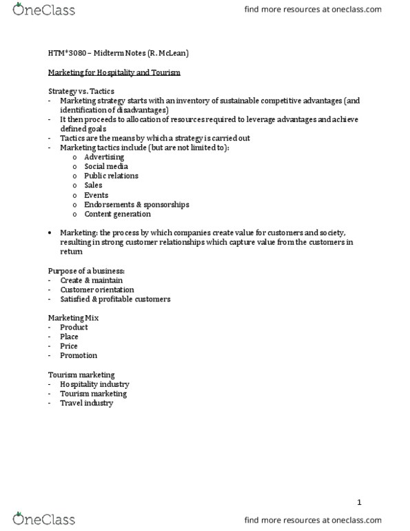 Htm 3080 Study Guide Fall 2016 Midterm Hospitality Industry Marketing Strategy Marketing Mix Tourism Jobs East London