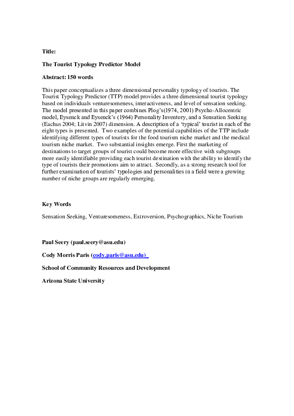 Pdf Building A Better Tourist Predictor A Three Dimensional Tourist Typology Paul Seery And Cody Paris Academia Edu Tourism Jobs Remote